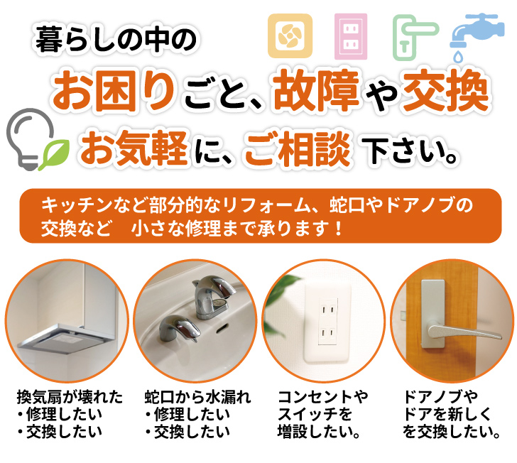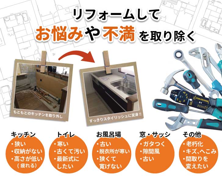 ・キッチンが狭い。 ・蛇口が水漏れする。 ・換気扇をかえたい。 ・コンロをかえたい。 ・収納が少ない。 ・キッチンの高さが合わない。 ・新しい食洗器をつけたい。 ・カウンターキッチンにしたい。 ・地震対策をしたい。 |